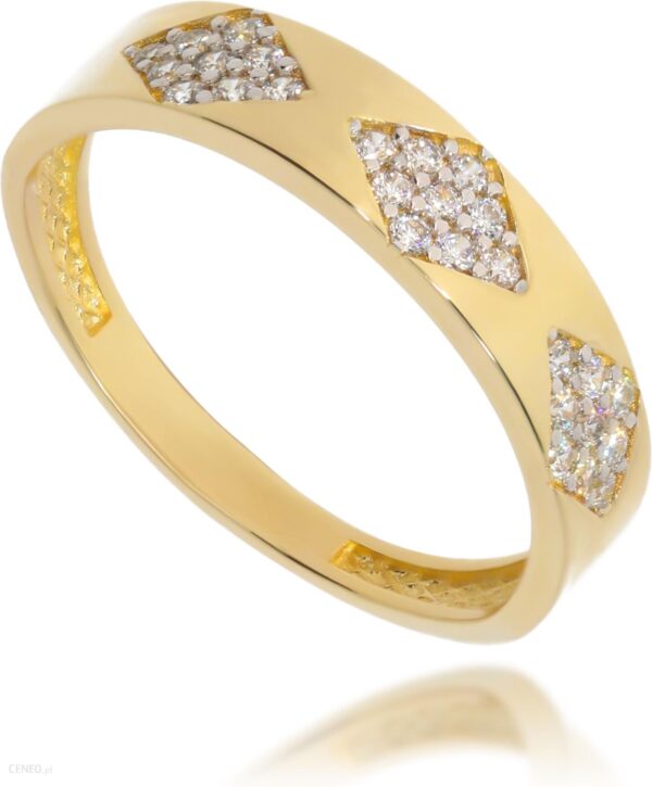 Wymiary: szerokość szyny z kamieniemi 4,5mm szerokość szyny dolnej 2,4 mm Złoty pierścionek przedstawiony w naszej ofercie został wykonany z wysokiej jakości złota próby 585. Biżuteria została stworzona z pasją i wielką precyzją, aby zapewnić komfort jej użytkowania. Złoty pierścionek przeznaczony jest dla wyjątkowej kobiety, umiejącej docenić prawdziwe piękno i ponadczasowość produktu. Proszę o wybranie odpowiedniego rozmiaru. W przypadku braku Twojego rozmiaru istnieje możliwość zwiększenia lub zmniejszenia pierścionka, po konsultacji z nami. W ofercie znajduje się bogaty wybór pierścionków charakteryzujący się różnorodnym wzornictwem i gramaturą. Są to pierścionki z diamentami lub z cyrkoniami w różnych kolorach zależnie od modelu.