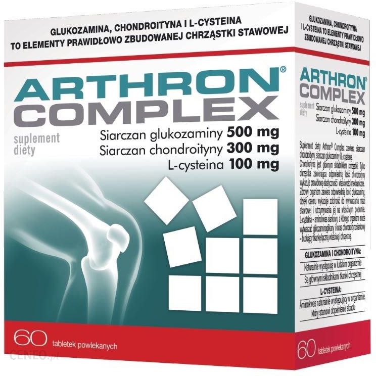 Skład Siarczan glukozaminy 500mg, Siarczan chondroityny 300mg, L-cysteina 100mg DziałaniePreparat ARTHRON® COMPLEX zawiera siarczan chondroityny, chlorowodorek glukozaminy oraz MSM. Siarczan chondroityny, jest głównym składnikiem chrząstki. Jest odpowiedzialny za jej prawidłową elastyczność i właściwości mechaniczne. Glukozamina to aminocukier wchodzący w skład substancji podstawowej chrząstki, w sposób naturalny pobudza organizm do wytwarzania mazi stawowej i utrzymuje ją na właściwym poziomie. MSM to związek bogaty w siarkę, która uczestniczy w procesie prawidłowego wytwarzania kolagenu – podstawowego składnika tkanki kostnej i chrzęstnej.