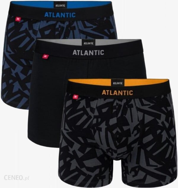 Bielizna w 3-paku od Atlantic. Przylegające do ciała bokserki o standardowym kroju wykonane z doskonałej jakości bawełny. Materiał dopasowuje się do Twojego ciała. Jest odporny na wysokie temperatury i rozciąganie. Dzięki temu bokserki na długo zachowują swój pierwotny kształt i kolor. W opakowaniu znajdziesz dwie pary bokserek pokrytych graficznymi wzorami z niebieskim i pomarańczowym napisem Atlantic oraz jedną parę czarnych gładkich z napisem szarym. Niska talia i uniwersalna długość nogawek to coś, co spodoba się każdemu mężczyźnie. Stosunkowo szeroka i nieuciskająca gumka oraz przyjemny w dotyku materiał gwarantują wysoki komfort noszenia.Materiał: 95% bawełna, 5% elastan