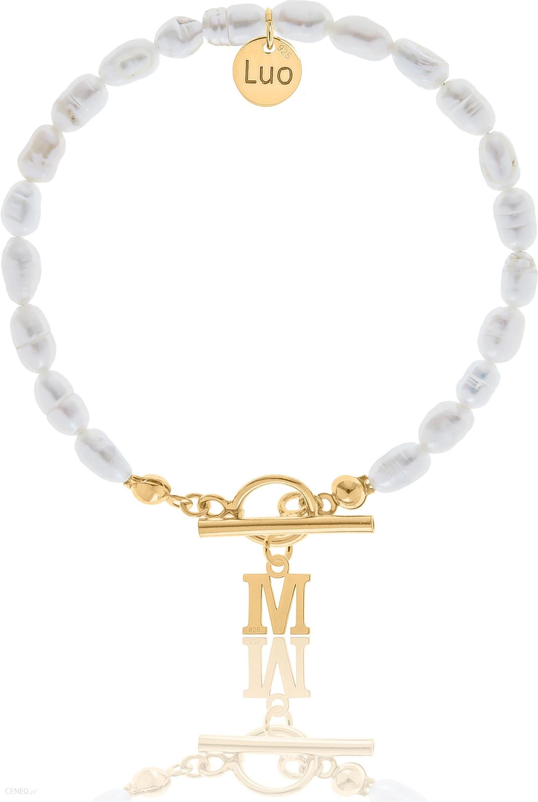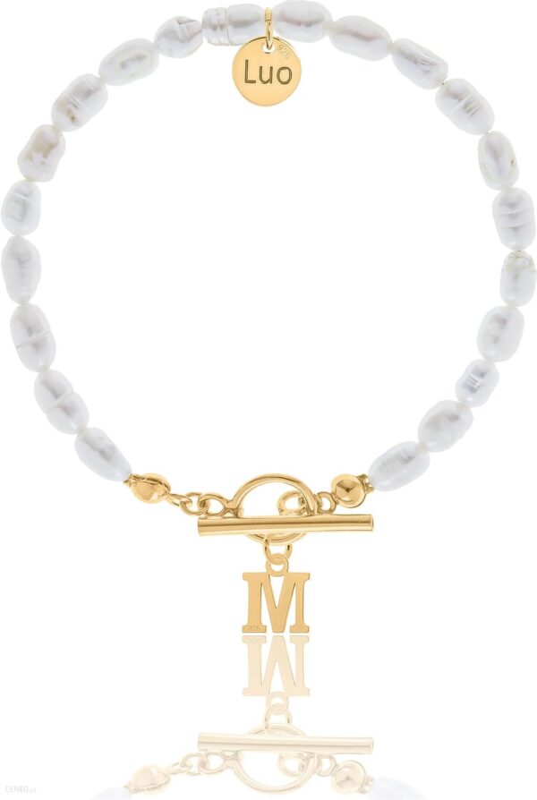 Bransoletka z naturalnych pereł z ozdobnym zapięciem i literką. Całość wykonana z naturalnych pereł w kolorze białym. Zawieszka, zapięcie i logo wykonane ze srebra 925 pokrytego 24 karatowym żółtym złotem.Perły (unikatowe): 5 – 6 mmLitera (literka): ok. 10 mmOzdobne zapięcie:Kółko: 9 mmPałeczka: 18 mmDługość: 18 cmZawieszka logo: 8 mmBiżuteria pakowana jest w ozdobne pudełko.