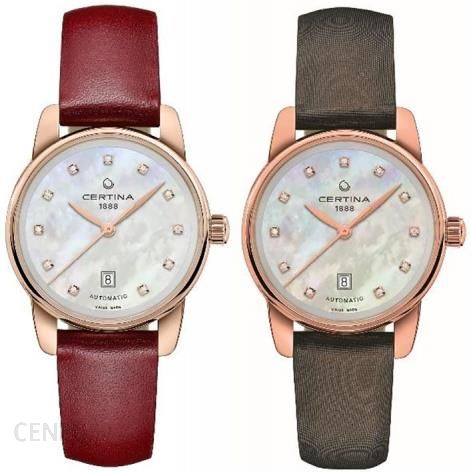 Certina C001.007.36.116.02 Certina DS Podium Lady Automatic DIAMONDS C001.007.36.116.02 Elegancki damski zegarek z diamentami, który zachwyca swym wyglądem. Dwa paski dołączone do zegarka z możliwością szybkiej zmiany sprawiają, że czasomierz będzie pasował do każdej stylizacji. Koperta szwajcarskiego zegarka została wykonana ze stali szlachetnej z powłoką PVD w kolorze różowego złota. Tarcza z masy perłowej sprawia, że każdy zegarek staje się unikalnym produktem, ponieważ wykonany jest z naturalnego materiału osiąganego ze skorup niektórych małż, każdy więc wzór jest unikatem. Delikatne wskazówki uzupełniają całość i w połączeniu z indeksami z diamentów tworzą piękną kompozycję. Datownik został umieszczony na godzinie szóstej w dyskretnej ramce. Zegarek umocowano na bordowym pasku z zapięciem motylkowym oraz możliwością szybkiej zmiany na pasek brązowy, bez konieczności posiadania dodatkowych narzędzi. Zegarek posiada mechanizm automatyczny, którego pracę można podziwiać przez przeszklony dekiel. Zaletą zegarka jest szafirowe szkło z powłoką antyrefleksyjną po obu stronach, które jest niezwykle odporne na zarysowania i zapewni trwałość na długie lata. Szczelność czasomierza jest na poziomie 100M, dlatego możemy nawet pływać z zegarkiem, co nie jest zalecane ze względu na skórzany pasek. Certina C001.007.36.116.02 to niebanalna propozycja dla kobiet z klasą, które cenią sobie piękno i wygodę. Piękna tarcza z diamentami stanowi olśniewające połączenie a szybka zmiana paska dodaje uniwersalności. Każda kobieta nie przejdzie obojętnie wobec tej propozycji marki Certina. Detal, który ma znaczenie Nietuzinkowe połączenie masy perłowej, diamentów oraz możliwość zmiany paska sprawiają, że otrzymujemy produkt z najwyższej półki dostosowany do potrzeb każdej kobiety. Główne zalety zegarka Czytelna tarcza Dwa paski w komplecie Diamentowe indeksy Masa perłowa na tarczy Automatyczny, precyzyjny mechanizm Ponadczasowy styl oraz elegancja Zegarek z jednej strony bardzo klasyczny, bez dodatkowych ozdobników z drugiej zaś emanuje pięknem wyjątkowej tarczy oraz luksusem w postaci diamentowych indeksów. Propozycja, którą musisz mieć w swojej kolekcji. Idealnie nada się również na prezent.