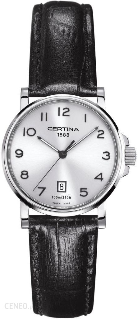 Koperta zegarka : StalKlasa wodoszczelności : 100M+DSSzkło : Szafirowe (nierysujące się)Kolor tarczy : SrebrnyTyp tarczy : Cyfry arabskieBransoleta : SkóraKolor bransolety : CzarnyTyp mechanizmu : Kwarcowy (na baterię)Wymiar koperty : 27mmGrubość zegarka : 7mmFunkcje zegarka : KalendarzCertina to szwajcarski producent czasomierzy będący własnością Swatch Group. Firma założona przez braci Alfreda i Adolfa Kurth w niewielkiej szwajcarskiej miejscowości Grenchen w 1888 roku. Nazwa Certina została nadana na 50-lecie istnienia przedsiębiorstwa.Pierwszy zegarek całkowicie wykonany przez braci Kutrh został skonstruowany w 1906 roku – damski zegarek nazywający się Granna. Model uzyskał międzynarodowe uznanie otrzymując w 1910 roku złoty medal na targach w Mediolanie oraz uhonorowany wyróżnieniami na targach w Brukseli i Bernie. Bracia Kurth byli pierwszymi, którzy wyprodukowali pierwszy zegarek mechaniczny z cyfrowym odczytem.Brand certina jest również partnerem teamu F1 BMW Sauber. Oficjalną twarzą reklamową producenta jest kierowca wyścigowy Robert Kubica.Niezawodność, precyzja i innowacyjność charakteryzują filozofię Certiny od 1888 roku, od powstania firmy przez braci Kurth. W 1959 roku Certina opracowała swój słynny system zabezpieczeń Double Security, DS Concept, nadając swoim zegarkom ponadprzeciętną wytrzymałość i nadzwyczajną wodoszczelność. Certina może poszczycić się wieloletnim zaangażowaniem w świat sportu, szczególnie sportu motorowego. Certina towarzyszyła w tryumfach takim wielkim gwiazdom jak Mike Doohan, Alex Crivillé, Petter Solberg, Sete Gibernau, Thomas Lüthi czy Robert Kubica, a także legendzie boksu Muhammadowi Ali. W 2005 roku Certina staje się Oficjalnym Partnerem zespołu BMW Sauber F1 Team.Certina jest marką Swatch Group, najpotężniejszej firmy zegarmistrzowskiej na świecie. Certina to przywódca na międzynarodowym rynku zegarków sportowych w przedziale cenowym od 700 do 4 600 zł. Firma ma swoje przedstawicielstwa w ponad 60 krajach.