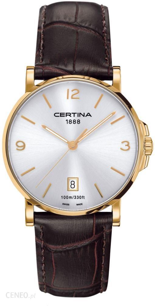 Certina DS Caimano Gent C0174103603700 Certina DS Caimano Gent C0174103603700 to interesujący model męski o ciekawej kolorystyce. Posiada pozłacaną kopęrtę kontrastującą z jasnym cyferblatem i brązowym paskiem. Wodoodporność tego modelu plasuje się na poziomie 100m. Atrybuty:Kolekcja – DS Caimano GentMechanizm kwarcowy (zasilany baterią) – najpopularniejszy rodzaj mechanizmu, jego siłę napędową stanowi bateria Gwarancja – 2 lataAnalogowy – wskazuje czas za pomocą wskazówek, nie posiada dodatkowych funkcji typu chronograf Data Pozłacany metodą PVD – pokrycie zegarka tą metodą zapewnia wzmożoną wytrzymałość na ścieranie i zarysowaniaPasek skórzany brązowy Tarcza ciemna Szkło szafirowe (odporne na zarysowania) – posiada 9/10 pkt w skali Mohsa, zarysować można je jedynie diamentem Wodoodporność 100m – daje możliwość pływania i nurkowania bez akwalungu Zegarek męski Styl zegarka – EleganckiŚrednica koperty – 38 mmWysokość koperty – 8,6 mmKoperta okrągłaOryginalne pudełko producentaInstrukcja obsługi