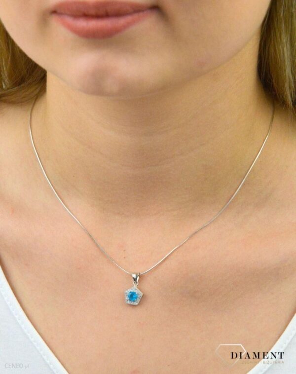Srebrna zawieszka wykonana z próby 925 ozdobiona większą niebieską cyrkonią i drobnymi białymi wokół. Tak skomponowany olśniewający wisiorek srebrny o wyjątkowym wzorze, w niezwykły sposób dopełni look wieczorowych oraz eleganckich stylizacji. Srebro jest cenionym materiałem wśród jubilerów. Zawieszkę można zestawić z inną biżuterią dostępną w naszej ofercie. Zawieszka to idealny pomysł na prezent dla każdej kobiety. Zastosowana w kolorze niebieskim cyrkonia idealnie komponuje się z otaczającym ją srebrem. Do zawieszki można dobrać łańcuszek dostępny w naszej ofercie.Srebrna biżuteria dostępna w naszym sklepie to połączenie klasy, stylu oraz elegancji. Starannie wyselekcjonowane dodatki zachwycają wysoką jakością użytych materiałów, dbałością o każdy, nawet najmniejszy szczegół oraz niebywałą precyzją wykonania. Stworzone z myślą o każdej kobiecie, doskonale prezentują się w każdych warunkach. Zapraszamy do zapoznania się z pozostałą częścią naszej wyjątkowej kolekcji.Zerknij na pozostałą ofertę!> Bransoletki damskie> Kolczyki srebrne> Pierścionki srebrne> Naszyjniki srebrneNasz sklep internetowy ze złotą i srebrną biżuterią Diament jest autoryzowanym dystrybutorem marki. Cała kolekcja złotej i srebrnej biżuterii Diament zakupiona w naszym sklepie posiadają 2 letnią gwarancję i zapakowane są w oryginalne opakowanie.