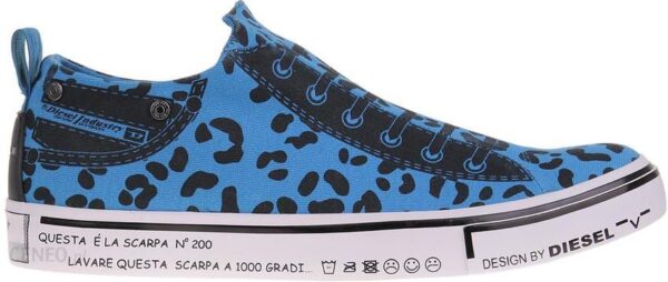Lekkie obuwie typu lifestyle, przeznaczone do użytku codziennego. Wykonane z bawełny z motywem lamparta. Gumowa podeszwa posiada na boku nadruk z instrukcją prania.materiał zewnętrzny: 85% bawełna, 15% elastan-spandeksmateriał wewnętrzny: tkaninakolor: niebieski/czerń