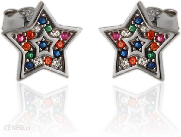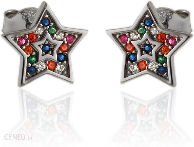 Kolczyki ze srebra próby 925 w kształcie gwiazd. Kolczyki ozdobione są kolorowymi kamieniami cyrkonia które ładnie prezentują się ze srebrnymi elementami. Srebro jest rodowane dzięki czemu jest ono bardziej odporne na działanie powietrza, nie ciemnieje.