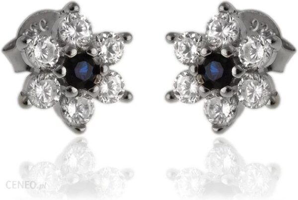 Kolczyki ze srebra próby 925. Subtelne kwiatki ozdobione białymi i szafirowymi kamieniami cyrkonia, które ładnie mienią się w świetle. Srebro jest rodowane dzięki czemu jest ono bardziej odporne na działanie powietrza, nie ciemnieje.
