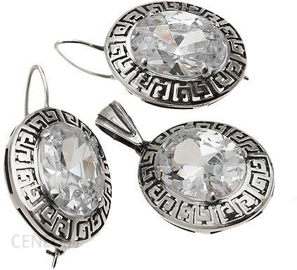 Komplet ze srebra próby 925, kolczyki i wisiorek ozdobione dużymi białymi cyrkoniami. Srebro jest specjalnie ciemnione (tak zwane srebro oksydowane), stylizowane na staroć, dzieki czemu komplet nie wymaga pielęgnacji. Biżuteria okazała i bardzo kobieca.