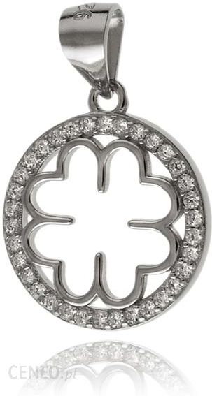 Wisiorek ze srebra, próba 925, kontur koniczynki zamknięty w kólku, ozdobiony kamieniami cyrkonia, które ładnie mienią się w świetle. Srebro jest rodowane dzięki czemu jest ono bardziej odporne na działanie powietrza, nie ciemnieje.