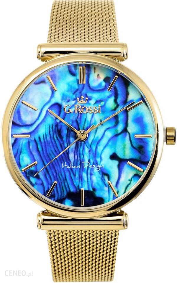 Zegarek G. Rossi model PORTA:Model Afrena ten to propozycja dla kobiet, zegarek wyposażony został w niezawodny japoński mechanizm kwarcowy, który współdziałając z baterią zapewnia bardzo dokładne odmierzanie czasu. Stalowa koperta zegarka została pokryta utwardzaną powłoką IPS/IPG. Tarcza tego zegarka bardzo czytelna. Całość zamontowana została na siatce typu mesh. Wodoszczelność na poziomie 30m. (3ATM) gwarantuje, że nie trzeba obawiać się drobnych zachlapań. Zdecydowanie nie jest to jednak zegarek przeznaczony do pływania lub nurkowania.Mechanizm:W zegarku osadzony został japoński mechanizm kwarcowy Citizen Miyota.Pasek/bransoleta:Stalowa, powlekana IPS/IPG.Koperta:Metalowa, powlekana IPS/IPGSzkiełko:Mineralne.Funkcje/specyfikacja:- tarcza sygnowana logiem producenta- Samodzielna możliwość regulacji zapięcia zegarka.Wodoszczelność:Water Resist 3 BAR (30M) zegarek jest odporny na przypadkowe zachlapania wodą np. podczas mycia rąk.Kolorystyka:Tarcza: kolor wielokolorowa,Wskazówki: kolor złoty,Koperta: kolor złoty,bransoleta: kolor złoty.Gwarancja:Pisemna 12 miesięcy.Wymiary:koperta: szer. 35 mm, wys. 40 mmtarcza: średnica 30 mmszerokość paska przy kopercie 16 mmgrubość zegarka: 7 mmzapięcie zegarka: 19,5 cmCo jest w zestawie?✔ 12-miesięczna gwarancja, realizowana przez nasz sklep.✔ Instrukcja obsługi w języku polskim✔ Oryginalny zegarek G. Rossi