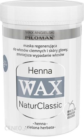 WAX NATURCLASSIC MASKA REGENERUJĄCA HENNA DO WŁOSÓW CIEMNYCH 480ML regeneruje oraz zmniejsza wypadanie.Maska regenerująca do włosów suchych i zniszczonych, ciemnych i do skóry głowy.Preparat zmniejszający wypadanie włosów. Rekomendowany przez trychologów. Polecany także w kuracji regenerującej dla osób w trakcie i po chemioterapii.REGENERACJAINTENSYWNE NAWILŻENIEZMNIEJSZONE WYPADANIE Formuła maski opracowana specjalnie z myślą o szczególnych potrzebach włosów suchych i zniszczonych, ze skłonnością do wypadania. Produkt zapobiega nadmiernej utracie włosów, wzmacnia je, nawilża i wygładza.Ekstrakt z zielonej herbaty – wspomaga mikrokrążenie skórne. Ekstrakt z henny wzmacnia mieszki i cebulki włosowe skutecznie przeciwdziałając nadmiernemu wypadaniu włosów i stymuluje wzrost nowych włosów. Po kuracji maską włosy są mocne, lśniące i zdrowsze.Formuła maski stosowanej w formie kompresu powoduje, że włosy suche i łamliwe stają się intensywnie zregenerowane, głęboko odżywione i pełne blasku.By wzmocnić skuteczność preparatu i osiągnąć trwałe efekty, Twoim włosom polecamy stosowanie w codziennej pielęgnacji także innych produktów z seriiWax.