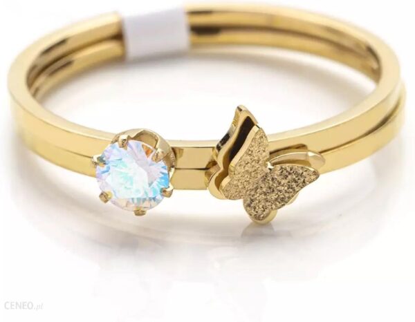 Dwa pierścionki jeden z podwójnym motylkiem a drugi z opalizującym kamieniemWykonane z wysokiej jakości stali w kolorze złotymMożna je rosić razem lub osobno, dowolnie dokładać inne elementy biżuteriiModny, oryginalny design jest uzupełnieniem stylizacji zarówno eleganckiej jak i casualowejPierścionek to świetny pomysł na prezent dla bliskiej osoby.Idealny dla kobiet, które lubią się wyróżnić w eleganckim stylu.Złoty kolor biżuterii pięknie podkreśla opaleniznę!