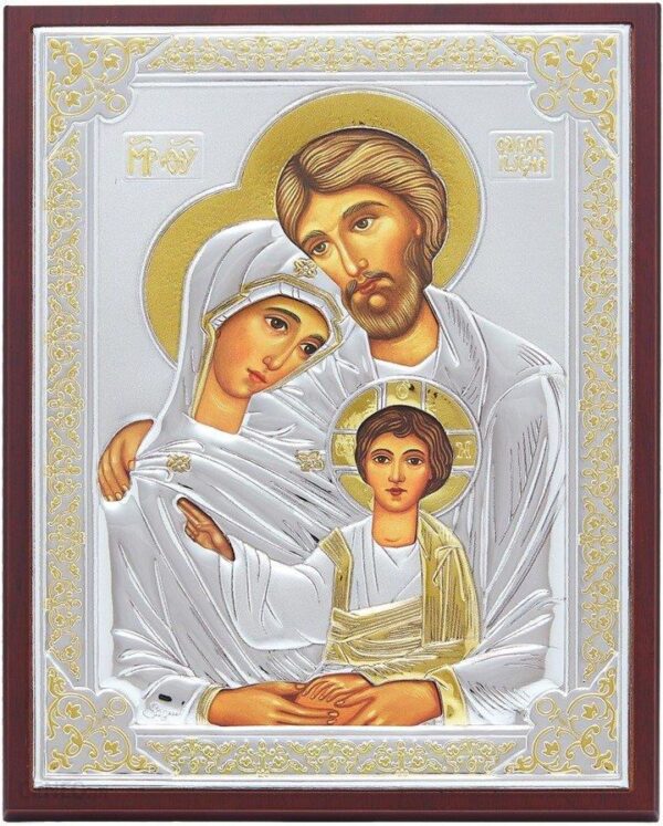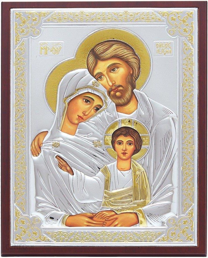Ikona srebrna przedstawiająca Świętą Rodzinę.Ikona wyprodukowana został przez firmę LAR International. Gwarantuje ona, iż przedmiot nabyty przez Państwa został wyprodukowany we Włoszech, z metalu pokrytego czystym srebrem w technologii PVD. Dzięki temu jest odporniejszy na odkształcenia mechaniczne i śniedzenie, doskonale odbija światło, co podkreśla szlachetność srebra. Obrazek zabezpieczony jest warstwą lakieru, która chroni przed czynnikami zewnętrznymi. Wpływa to na bezproblemowe użytkowanie bez potrzeby częstego czyszczenia.Ikonę można zarówno powiesić, jak i postawić na dołączonej podstawce.Do czyszczenia zalecamy używanie wyłącznie czystych, miękkich ściereczek, a w przypadku zabrudzeń letniej wody. Nie należy stosować detergentów, alkoholu ani znajdujących się w sprzedaży środków i ściereczek do czyszczenia srebra, gdyż mogą one uszkodzić warstwę ochronną.