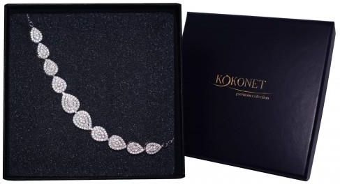 Bransoletka ślubna z łezkami to jeden z najczęstszych wyborów dokonywanych przez przyszłe Panny Młode. Łezki są klasyczne, a dzięki swojej uniwersalności stanowią uzupełnienie zarówno do rustykalnych sukien w stylu boho, jak i gładkich, prostych sukien ślubnych. Wymiary: Długość bransoletki: 17,50cm + 5,00 cm regulacji, część ozdobna na długości 9,00 cm, Szerokość maksymalna: 0,80 cm Kolor: kryształowy, srebrny, silver Materiał: Specjalnie zaprojektowany stop jubilerski, hipoalergiczny, zabezpieczony przed czernieniem warstwą rodu. Wysoką estetykę zapewniają cyrkonie szlifowane sześciennie klasy AAA+ oprawiane ręcznie. Logo KOKONET gwarantuje wysoką jakość! Każde zamówienie pakujemy w gustowne pudełko z logo marki całkowicie bezpłatnie