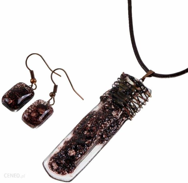 Komplet biżuterii szklanej składa się z małych prostokątnych kolczyków oraz smukłego designerskiego wisiorka na szyję, wykonanych z brązowego barwionego szkła o strukturze przypominającej lawę. Komplet biżuterii szklanej wykonane są ręcznie, a każdy egzemplarz jest oryginalny.Wymiary:wisiorek: 1,5 x 6,5 cmkolczyk: 1 x 1,5 cmMateriał zawiasów:wisiorek: skóra w kolorze brązowym, długość 43 cmkolczyki: miedź – nie zawierają niklu