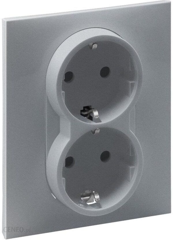 Gniazdo SCHUKO 2x2P+Z z przesłoną – zaciski automatyczne (monoblok) . Gniazdo umożliwia podłączenie urządzeń elektrycznych i elektronicznych. Mechanizm wymaga dodania ramki. Kolor Aluminium.O serii SUNO: