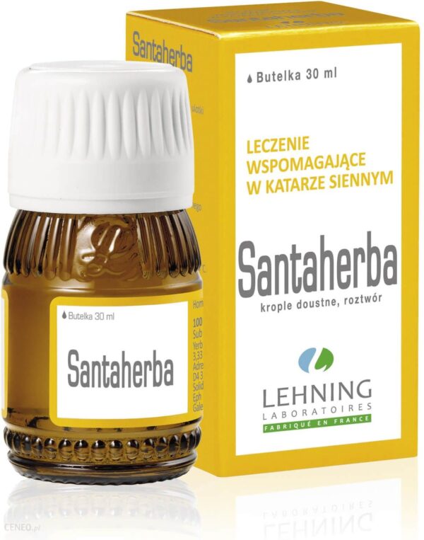 Lehning Santaherba na astmę krople 30mlKrople doustne Santaherba to preparat wskazany do stosowania wspomagającego w leczeniu kataru siennego. Nadaje się również do leczenia różnych postaci astmy, zapaleń obturacyjnych oskrzeli. Preparat wykazuje także korzystne działanie na układ krążenia i układ nerwowy. Przeznaczony dla dzieci powyżej 6. roku życia i dla dorosłych.