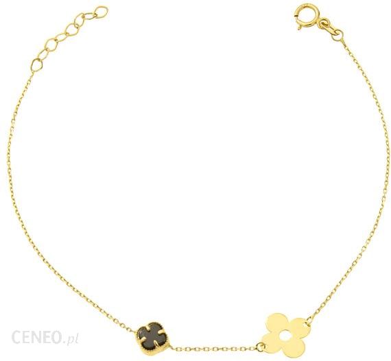 Złota bransoletka z koniczynką i kwiatkiem pr. 585 Niezwykle oryginalna złota bransoletka z koniczynką i kwiatkiem z czarnej masy perłowej. Nowoczesna forma nada szyku każdej kreacji. Idealny prezent dla wyjątkowej osoby. Produkt dostępny w naszej ofercie wykonany jest ze złota próby 585 – co jest potwierdzeniem wysokiej jakości i trwałości biżuterii. Biżuteria zapakowana w ozdobne pudełko będzie wspaniałym prezentem. materiał: złoto kolor złota: żółty próba: 585 waga: ok. 1,07 g wymiary koniczynki: 10 x 10 mm wymiary kwiatka: 7 x 7 mm długość regulowana: 17 – 19 cm szerokość łańcuszka: 1 mm model: GP.04.0092