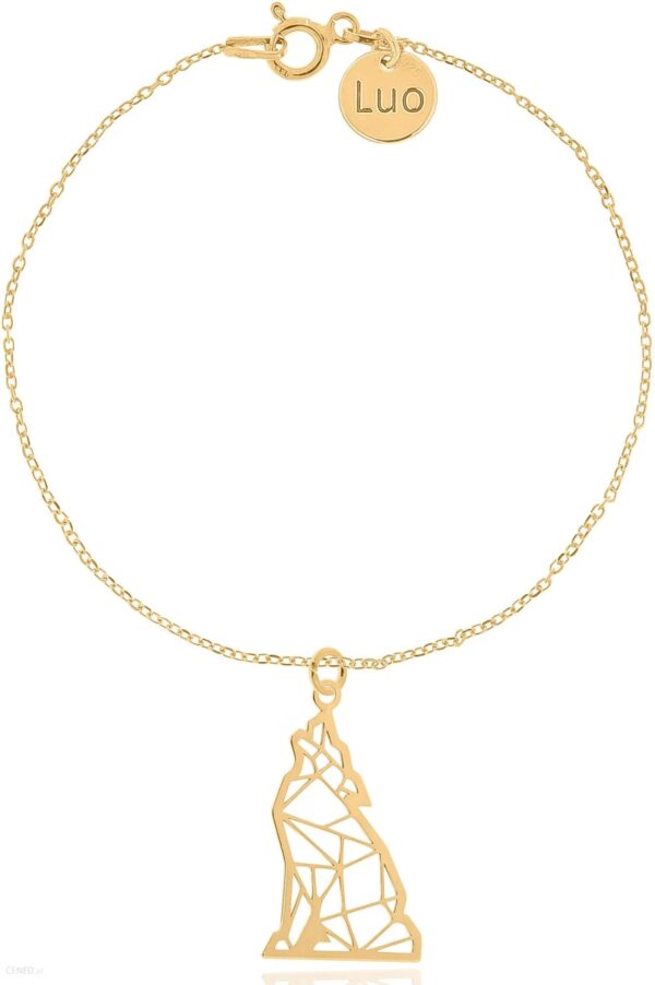 Bransoletka srebrna pozłacana z wilkiem. Całość wykonana ze srebra 925 pokrytego 24 karatowym żółtym złotem.Wilk origami: 22,5 x 13,2 mmDługość bransoletki: 18 cmZawieszka logo: 8 mmGrubość łańcuszka: 1 mmBiżuteria pakowana jest w ozdobne pudełko.