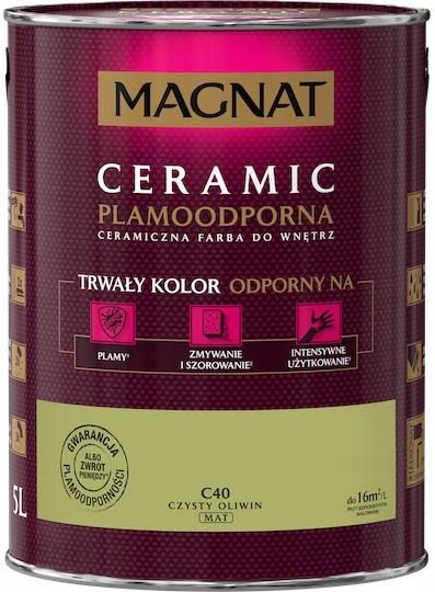 MAGNAT Ceramic to farba do ścian i sufitów, bazująca na najwyższej jakości ceramicznych komponentach, żywicach i pigmentach. Unikalna formuła gwarantuje trwałość koloru i jego odporność na plamy, zmywanie, szorowanie i intensywne użytkowanie. Farba MAGNAT Ceramic tworzy powłoki, które nie absorbują zabrudzeń i trudnych plam.Dostępne pojemności: 2.5L, 5LIlość warstw: 2Metoda aplikacji: wałek, natryskWydajność: do 16 m2/L przy jednokrotnym malowaniu