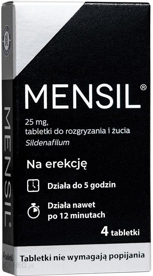 Opis produktu / Wskazania i działanie:Mensil to tabletki na erekcję, które zawierają skuteczną1 i najbardziej znaną2 substancję syldenafil w dawce 25 mg, która wspomaga uzyskanie i utrzymanie erekcji. Mensil poprawia erekcję. Pod wpływem pobudzenia seksualnego, syldenafil ułatwia napływ krwi do prącia. Pomaga dzięki temu uzyskać i utrzymać erekcję.Lek z syldenafilem na zaburzenia erekcji, dostępny bez recepty.Działa nawet po 12 minutach od zażycia i ułatwia osiągnięcie erekcji do 5 godzin po zażyciu tabletki3.Dyskretne tabletki do rozgryzania i żucia, które po przegryzieniu rozpuszczają się w ustach i nie wymagają popijania.Lek na zaburzenia erekcji Mensil przeznaczony jest do stosowania u mężczyzn powyżej 18. roku życia, zmagających się z zaburzeniami erekcji – niezdolnością do uzyskania lub utrzymania erekcji prącia,  wystarczającej do odbycia stosunku seksualnego. Mensil pomaga osiągnąć erekcję jedynie pod warunkiem wcześniejszego pobudzenia seksualnego.1. Dadej R. Etiologia i leczenie zaburzeń wzwodu prącia. Geriatria 2008; 2: 182-193.2. Na podstawie danych IMS Dataview PRM0221 G04E1 ERECT DYS PRD PDE5 INHIB, OTFMR0221 12C2C 12C2CUROLOGICAL M-CAPS/TA.3. Na podstawie Charakterystyki Produktu Leczniczego Mensil, pkt 5. ppkt.5.1.Co zawiera lek na erekcję Mensil – skład:Substancją czynną leku na zaburzenia erekcji Mensil jest syldenafil. 1 tabletka do rozgryzania i żucia zawiera 25 mg syldenafilu w postaci cytrynianu. Pozostałe składniki (substancje pomocnicze) to: polakrylina potasowa, krzemionka koloidalna bezwodna, laktoza jednowodna, powidon K-30, aspartam (E 951), kroskarmeloza sodowa, aromat miętowy, magnezu stearynian, potasu wodorotlenek (do ustalenia pH) i kwas solny (do ustalenia pH).Postać farmaceutyczna: Tabletki do rozgryzania i żucia. Białe, trójkątne, dwuwypukłe tabletki oznakowane jednostronnie liczbą „25”.Mensil – dawkowanieTen lek należy zawsze stosować dokładnie tak, jak to opisano w ulotce dla pacjenta lub według zaleceń lekarza, farmaceuty lub pielęgniarki. W razie wątpliwości należy zwrócić się do lekarza, farmaceuty lub pielęgniarki.Lek na zaburzenia erekcji Mensil należy stosować w dawce 25 mg, nie częściej niż raz na dobę. Lekarz po konsultacji może zalecić inny sposób dawkowania.Nie należy przyjmować leku Mensil z innymi preparatami zawierającymi syldenafil.Mensil należy przyjmować na około godzinę przed planowaną aktywnością seksualną. Tabletkę należy rozgryźć i żuć. Tabletki nie wymagają popijania.W przypadku wrażenia, że działanie leku Mensil jest za mocne lub za słabe, należy zwrócić się do lekarza lub farmaceuty.Tabletki na erekcję Mensil ułatwiają osiągnięcie erekcji pod warunkiem uprzedniego pobudzenia seksualnego. Czas, po którym występuje działanie leku Mensil jest różny u różnych pacjentów, zwykle wynosi od pół godziny do jednej godziny. Działanie leku Mensil może nastąpić później,, jeśli lek zażyto po obfitym posiłku.Należy skontaktować się z lekarzem, gdy po zastosowaniu leku Mensil nie dochodzi do erekcji lub gdy czas trwania wzwodu nie jest wystarczający do odbycia stosunku płciowego..Przyjęcie większej niż zalecana dawka leku na erekcję Mensil: Istnieje wówczas większe ryzyko wystąpienia i nasilenia działań niepożądanych. Nie należy stosować większej ilości tabletek niż zalecana. Należy skontaktować się z lekarzem w razie przyjęcia większej ilości tabletek niż zalecono. Przyjęcie dawki większej niż 100 mg nie oznacza zwiększonej skuteczności leku. Przeciwwskazania / Kiedy nie stosować leku na zaburzenia erekcji Mensil?Mensil – tabletki na erekcję są przeciwwskazane:jeśli pacjent ma uczulenie na którykolwiek składnik leku;jeśli pacjent przyjmuje azotany (leki te są często stosowane w celu łagodzenia objawów dławicy piersiowej („bólu w klatce piersiowej”)) lub leki uwalniające tlenek azotu (takie jak azotyn amylu, tzw. poppers) – ich jednoczesne stosowanie może prowadzić do niebezpiecznego spadku ciśnienia tętniczego krwi;jeśli pacjent przyjmuje riocyguat, stosowany w leczeniu nadciśnienia płucnego (tj. wysokiego ciśnienia krwi w płucach) i przewlekłego zakrzepowo-zatorowego nadciśnienia płucnego (tj. wysokiego ciśnienia w płucach spowodowanego przez zakrzepy krwi) – wykazano, że inhibitory PDE5, takie jak lek Mensil, nasilają działanie obniżające ciśnienie krwi przez ten lek;w przypadku ciężkich chorób wątroby lub serca;po niedawno przebytym udarze lub zawale serca, a także w przypadku niskiego ciśnienia tętniczego krwi;jeśli u pacjenta występują dziedziczne zmiany degeneracyjne siatkówki, takie jak zwyrodnienie barwnikowe siatkówki;jeśli u pacjenta kiedykolwiek stwierdzono utratę wzroku w wyniku niezwiązanej z zapaleniem tętnic przedniej niedokrwiennej neuropatii nerwu wzrokowego (tzw. NAION).