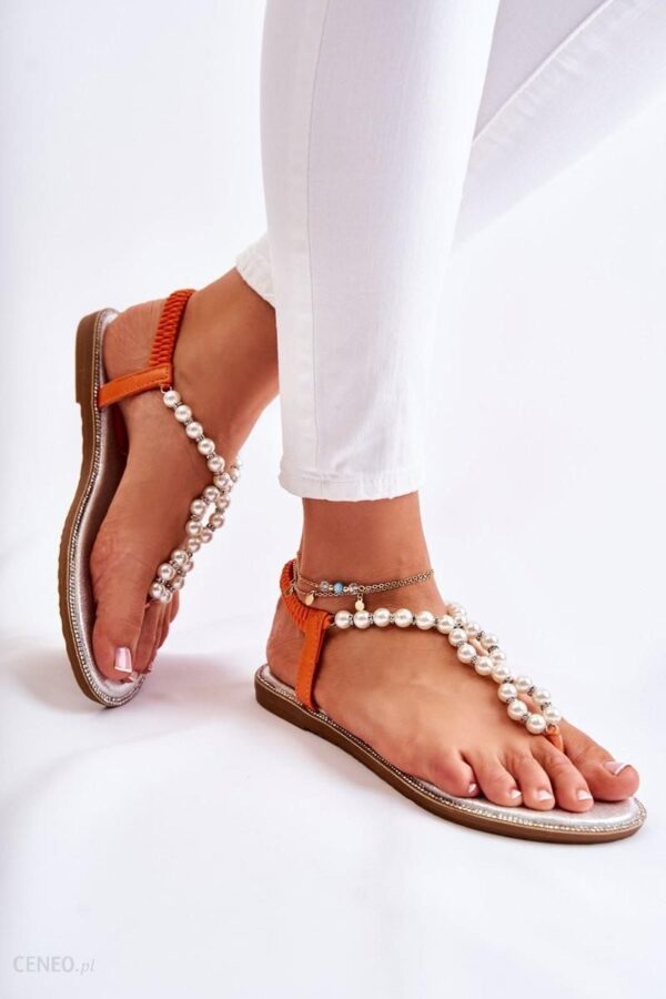 Sandały typu japonki osadzone na płaskim obcasie. Posiadają antypoślizgową, gumową podeszwę. Eko skórzany ściągacz łączy się z ozdobnymi paskami z imitacją cyrkonii i pereł. Model wsuwany. Miękka wkładka wykonana z materiału zapewni komfort podczas użytkowania. Podeszwa przyozdobiona cyrkoniami. Sandały świetnie będą prezentować się z wieloma stylizacjami! Przy wyborze rozmiaru prosimy kierować się tabelą rozmiarów. 36-23,5/37-24/38-24,5/39-25/40-26/41-26,5cm