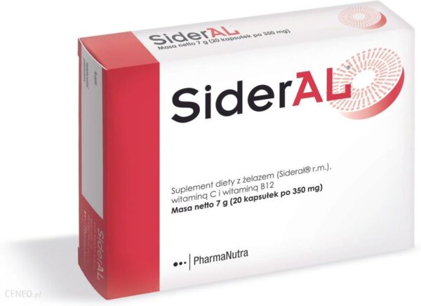 Stosowanie:1 kapsułka dziennie.Składniki:żelazo Sideral r.m. (pirofosforna żelaza (III)), skrobia ryzowa, emulgatory: estry sacharozy i kwasów tłuszczowych, lecytyna słonecznikowa, białka mleka, substancja przeciwzbrylająca: fosforan triwapniowy, żelatyna, witamina C (kwas L-askorbinowy); substancja wyprełniająca: celuloza mikrokrystaliczna; substancje przeciwzbrylające: hydroksypropylometyloceluloza, sole magnezowe kwasów tłuszczowych, dwutlenek krzemu; witamina B12 (cyjanokobalamina), barwniki: tlenki i wodorotlenki żelaza, dwutlenek tytanu