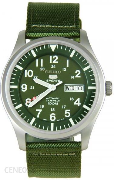 Wyrazistyzegarek marki SEIKO. Idealny na co dzień, jak również niezbędny podczasweekendowych wypadów. Cechą charakterystyczną tego czasomierza jest mechanizmautomatyczny nakręcany poprzez ruchy nadgarstka. Dzięki temu nie potrzebuje onbaterii. Czasomierz o sportowym charakterze z funkcjonalnym datownikiempokazującym dzień tygodnia i miesiąca. Solidny, nylonowy pasek w kolorzewojskowej zieleni. Obudowa wykonana z wysokiej jakości stali szlachetnej omatowej fakturze w kolorze szarości. Koperta o klasycznych wymiarach, bardzoczytelna. Wyraźne indeksy godzinne umieszczone na tarczy spójnej kolorystyczniez paskiem nie sprawiają problemu z odczytem godziny. Zarówno indeksy, jak iwskazówki zostały pokryte proszkiem luminescencyjnym, dzięki czemu świecą wciemności, zjawisko fluorescencji. Logo firmy na godzinie dwunastej (12:00).Wodoszczelność na poziomie 100m / 10ATM, podwyższony współczynnik. Idealnyprezent dla ukochanej osoby. Pełna dokumentacja. Zapakowany w unikatoweopakowanie SEIKO.Męski zegarek automatyczny (precyzyjny japoński mechanizm)Szkiełko mineralne odporne na zarysowania, płaskieObudowa (koperta) z szarej stali szlachetnej, matowa fakturaTarcza w kolorze zielonym, białe indeksyNylonowy (parciany) pasek (zielony) z bezpiecznym, stalowymzapięciemSzerokość paska przy zapięciu: 22 mmSzerokość paska przy kopercie: 22 mmTrzy wskazówkowy, analogowy mechanizm automatycznyDatownik pokazujący dzień tygodnia oraz miesiącaWodoszczelność do 100 m / 10 ATM, podwyższony współczynnikŚrednica koperty (bez koronki): 42 mmGrubość koperty: 12 mmObwód maksymalny nadgarstka: 22,0 cmObwód minimalny nadgarstka: 16,5 cmWaga: 82 gramyZegarek z metkami zapakowany w oryginalne opakowanie wraz zPOLSKĄ INSTRUKCJĄ(podbita książeczka gwarancyjna)