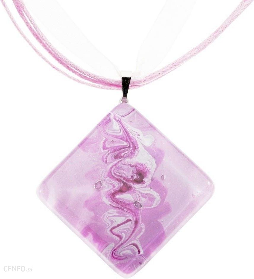 Wisiorek ze szkła w kształcie rombu na szyję. Oryginalny abstrakcyjny wzór jest namalowany w kolorze bordowym i białym na nieprzezroczystym różowym tle. Szklane wisiorki wykonane są ręcznie, a każdy egzemplarz jest oryginalny.Wymiary:3 x 3 cmMateriał zawiasu:- woskowane sznurki ze wstążką z organzy- długość 42 cm + 5 cm łańcuch przedłużający