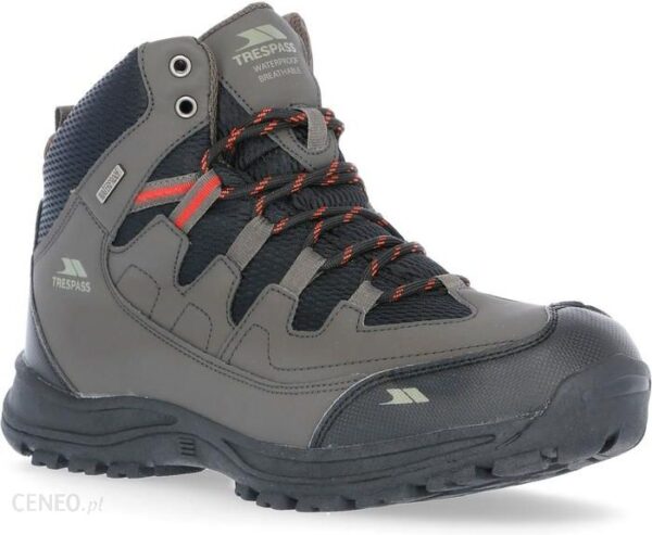 Buty trekkingowe wysokie męskie Finley Mid Trespass wykonane zostały z mocnego materiału PU, oraz gęstej, oddychającej siatki. Dzięki zastosowaniu membrany Tres-tex buty są wodoodporne, oraz oddychające. Posiadają lekką podeszwę z wytrzymałej gumy TPR o agresywnym bieżniku, która zapewnia bardzo dobrą przyczepność do podłoża. Formowana wkładka z pianki EVA zapewnia odpowiednią amortyzację dla naszych stóp. Buty posiadają język wykonany z gęstej siateczki, oraz lekką cholewkę. Buty te świetnie nadają się na trekkingi, górskie wycieczki jak i do co dziennego użytkowania w mieście.Technologie:Tres-tex – to autorska membrana wodoodporna stworzona specjalnie dla marki Trespass. Jej parametry wyraża się w milimetrach, oznaczają one wysokość słupa wody potrzebnego, aby dany materiał zaczął przesiąkać, np. w przypadku membrany Tres-tex 3 000, oznacza to, że materiał nie przepuści słupa wody o wysokości 3m. Membrana Tres-tex jest również oddychająca, wiatroszczelna, oraz posiada klejone szwy. Jej giętka i wytrzymała konstrukcja pomaga nie dopuszczać wody i odprowadzać na zewnątrz wilgoć twojego ciała. Membrany Tres-Tex® są również dostępne w wersji Stretch.