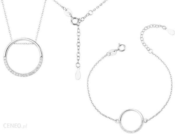 Elegancki rodowany srebrny komplet gwiazd składający się z naszyjnika oraz bransoletki, zdobionych dużymi kółeczkami wysadzanymi białymi cyrkoniami, model Z1456Z.