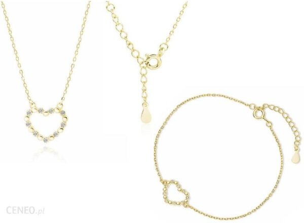 Elegancki wykonany z pozłacanego srebra komplet, składający się z naszyjnika oraz bransoletki przyozdobionymi serduszkami wykonanymi z połączonych ze sobą kółeczek i wysadzanych białymi cyrkoniami, model Z1812ZG_W.