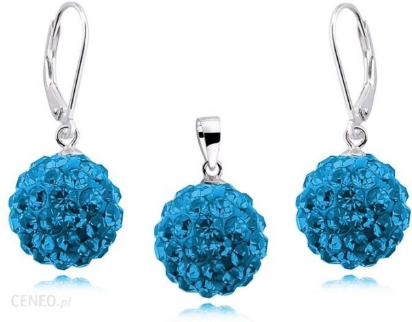 Elegancki wiszący srebrny komplet kulek o średnicy 12mm, wysadzanych kryształkami Swarovski w kolorze capri blue, składający się z kolczyków na angielskim zapięciu oraz wisiorka, model CRH0010DZ12.