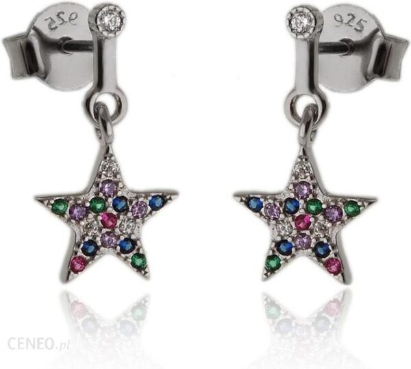 Delikatne wykonane z rodowanego srebra wiszące kolczyki na sztyfcie, zdobione gwiazdką wysadzaną kolorowymi cyrkoniami, model K2844.