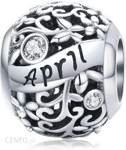 Elegancki wykonany z rodowanego srebra charms pasujący do bransolet modułowych, o kształcie kuleczki zdobiony ażurowym wzorem, cyrkoniami oraz napisem April, symbolizującym miesiąc kwiecień, model CHARM217.