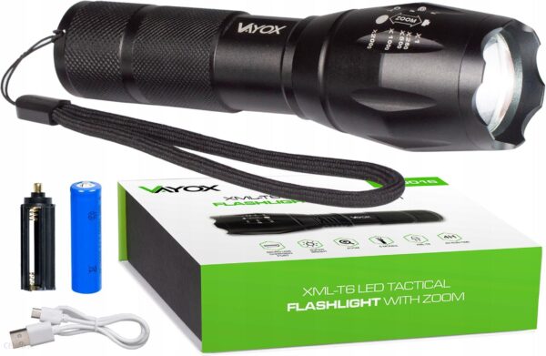 Vayox Taktyczna Xml T6 Led Va0016 Zasilanie latarki: akumulator Li-ion 18650 6800mAh 4,2V (w zestawie) lub 3x bateria AAA 1,5V (koszyczek w zestawie). Do pracy w każdych warunkach.Wiemy jak ważne jest to żeby latarka zawsze była gotowa do pracy niezależnie od warunków, specjalny system uszczelek zabezpiecza naszą latarkę przed wilgocią i kurzem. Klasa wodoodporności IP66. Odporna na zakurzenia. Uwaga nie wolno latarki zanurzać w wodzie! 5 Trybów Świecenia. Tryby zmienia się pomarańczowym przyciskiem na końcu latarki. Pełna moc, Średnia moc, Tryb oszczędny, Tryb pulsacyjny, Tryb SOS Zoom. Płynna zmiana ogniskowej padania światła, przy wykorzystaniu soczewki skupiającej. Daje to możliwość regulacji od wąskiego mocnego promienia światła o dalekim zasięgu ok.800 metrów, do szerokiej wiązki, która oświetla duży obszar roboczy. Te cechy sprawiają, że latarka sprawdzi się w każdym terenie. Skuteczny zasięg ponad 600 metrów. Maksymalny zasięg ponad 800 metrów. Ładowana z USB. Nasza latarka ładowana jest bezpośrednio z gniazda usb, niezależnie czy jest to twoja ładowarka od smartphone czy gniazdo usb w samochodzie. Dioda kolorem zielonym sygnalizuje pełne naładowanie. Całość ładowana jest poprzez kabel USB.Czas ładowania ok 2 godzinyCzas pracy 3-4 godziny