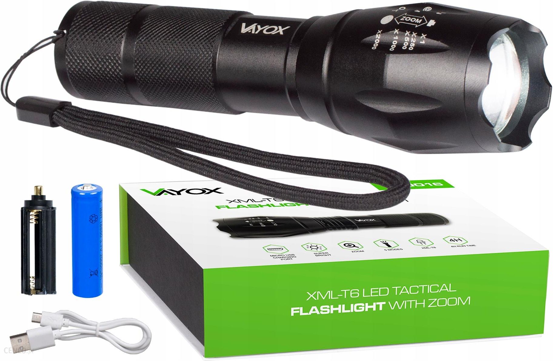 Latarka taktyczna XML-T6 LED VA0016 VAYOXNajmocniejsza dioda CREE T6 o mocy 1000 lumenówAkumulator 18650 pozwala na 4 godziny pracy Strumień świetlny o mocy 1000 lumenów Wykonana z aluminium (Odporna na zarysowania) Zasięg maksymalny: 800 metrów Pokryta: Anodyzowaną powłoką Wodoodporna Funkcja zoom (regulowany) Czas pracy do 4 godzinMożliwość użycia baterii zamiennie za akumulator W zestawie: Latarka taktyczna, smycz na rękę, akumulator 18650, kabel micro usb, koszyk na baterie, oryginalne opakowanie) 5 trybów świecenia Pełna moc Średnia moc Tryb oszczędny Tryb pulsacyjny Tryb SOS