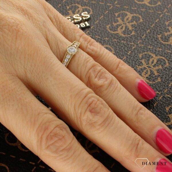 Złoty pierścionek w połączeniu z cyrkonią to bardzo klasyczna propozycja. Pierścionek świetnie się sprawdzi w wyjątkowej chwili takiej jak zaręczyny. Taki pierścionek ma dla obdarowanej osoby szczególną wartość. Klasyczny pierścionek na zaręczyny to połączenie żółtego złota z kamieniem w kolorze białym. Taki pierścionek zachowuję swój ponadczasowy charakter i może być również noszony jako biżuteria codzienna, do każdego stroju. Taki pierścionek zestawiony z obrączką wygląda idealnie. Pierścionek został wykonany z wysokiej jakości złota próba 333. Pierścionek ozdobiony cyrkonią w centralnej części oraz kilkoma mniejszymi na ramionach pierścionka. Pierścionek z pewnością przypadnie do gustu kobiecie szukającej eleganckiego dodatku do swoich stylizacji.Złota biżuteria dostępna w naszym sklepie to połączenie klasy, stylu oraz elegancji. Starannie wyselekcjonowane dodatki zachwycają wysoką jakością użytych materiałów, dbałością o każdy, nawet najmniejszy szczegół oraz niebywałą precyzją wykonania. Stworzone z myślą o każdej kobiecie, doskonale prezentują się w każdych warunkach. Zapraszamy do zapoznania się z pozostałą częścią naszej wyjątkowej kolekcji.> Złote pierścionkiStwórz komplet!> Złote naszyjniki> Złote kolczyki> Złote bransoletkiNasz sklep internetowy ze złotą biżuterią Diament jest autoryzowanym dystrybutorem marki. Cała kolekcja złotej biżuterii Diament zakupiona w naszym sklepie posiadają 2 letnią gwarancję i zapakowane są w oryginalne opakowanie.