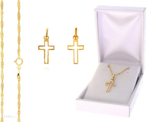 Komplet w skład którego wchodzi piękny i unikatowy krzyżyk oraz łańcuszek singapur wykonane z najwyżej jakości złota próby 585 ( 14k ).Wraz z biżuterią otrzymasz ozdobne pudełko, w którym na Twoje życzenie umieścimy wygrawerowaną dedykację.Parametry krzyżyka:Wysokość z zawieszką: ok. 21,6 mmWysokość: ok. 14,3 mmSzerokość: ok. 9,2 mmWaga: ok. 0,42-0,62 gParametry łańcuszka:Szerokość: ok. 1 mmWaga: 0,62 – 0,82 gSplot: singapurDługość: ok. 45 cm